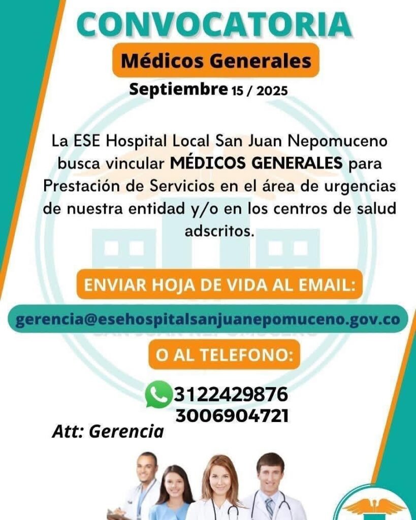 La ESE hospital local de San Juan Nepomuceno abrió la convocatoria para vincular a médicos generales en el centro asistencial.