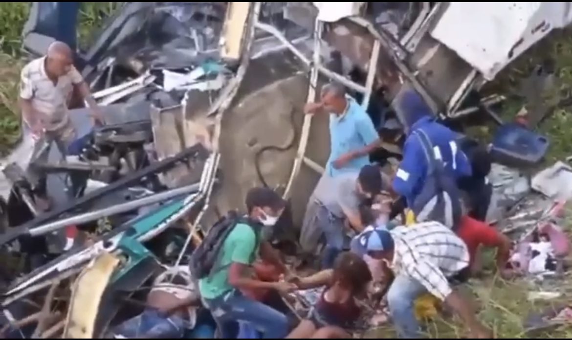 Al parecer el choque generó que el bus cayera del puente dejando heridas a decenas de personas, incluso a menores.