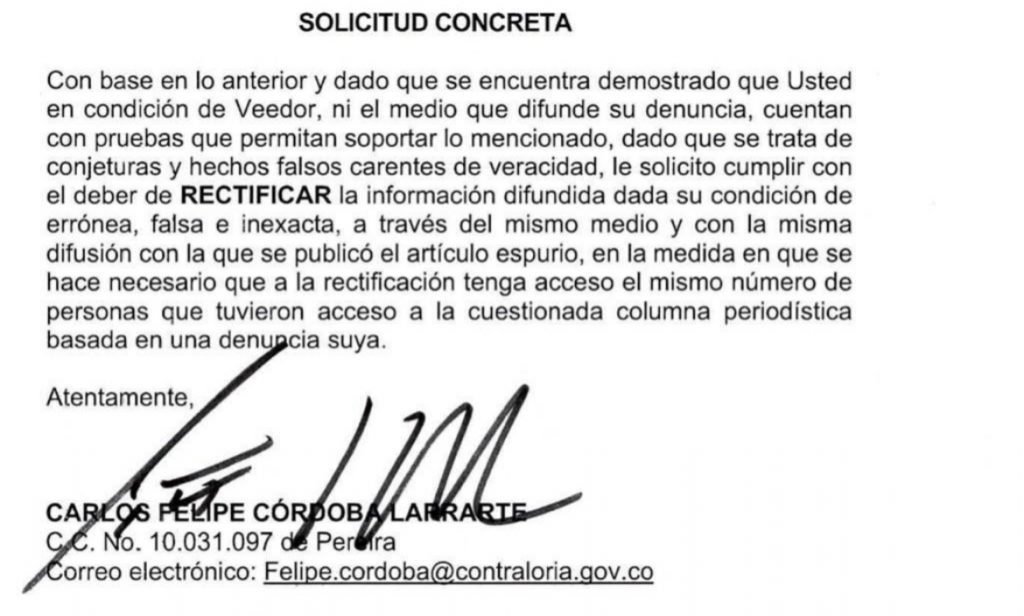 El Contralor General de la República, Carlos Felipe Córdoba Larrarte, solicitó rectificación inmediata de la supuesta información falsa y temeraria arrojada por el veedor cartagenero, Jorge Eliecer Quintana Sosa, publicada el pasado 25 de septiembre de 2021 en el diario El Publimetro. Dicho artículo fue titulado “Veedor denuncia presunto favorecimiento de contralor general hacia caso contra exgobernador de Bolivar – El funcionario sería amigo personal del investigado”.